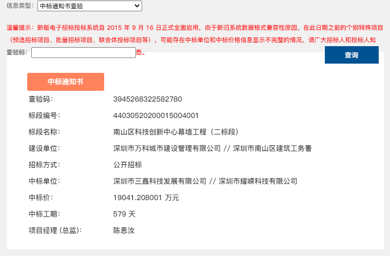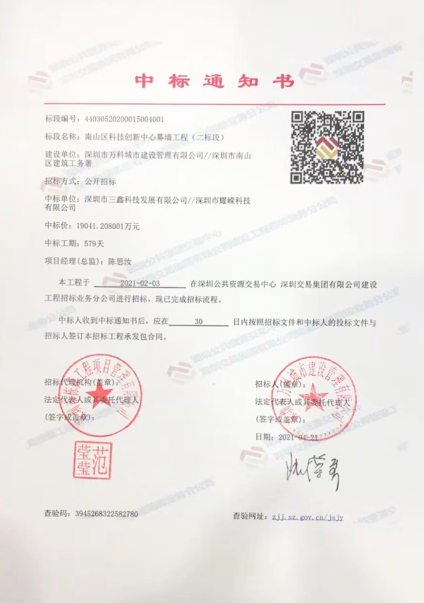 近日,,深圳尊龙时凯科技有限公司、、、、深圳市三鑫科技发展有限公司联合体中标南山区科技创新中心幕墙工程(二标段)项目,,中标总价:19041.208001 万元,,中标工期 579 天。。